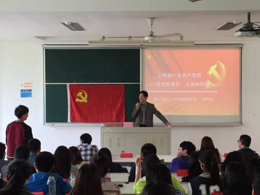 4月8日下午,第65期党的基础培训班之第二次党课在教学楼F102举行,此次党课邀请电子电气工程学院组织员周科亮主讲,主题为“怎样做一名共产党员”。