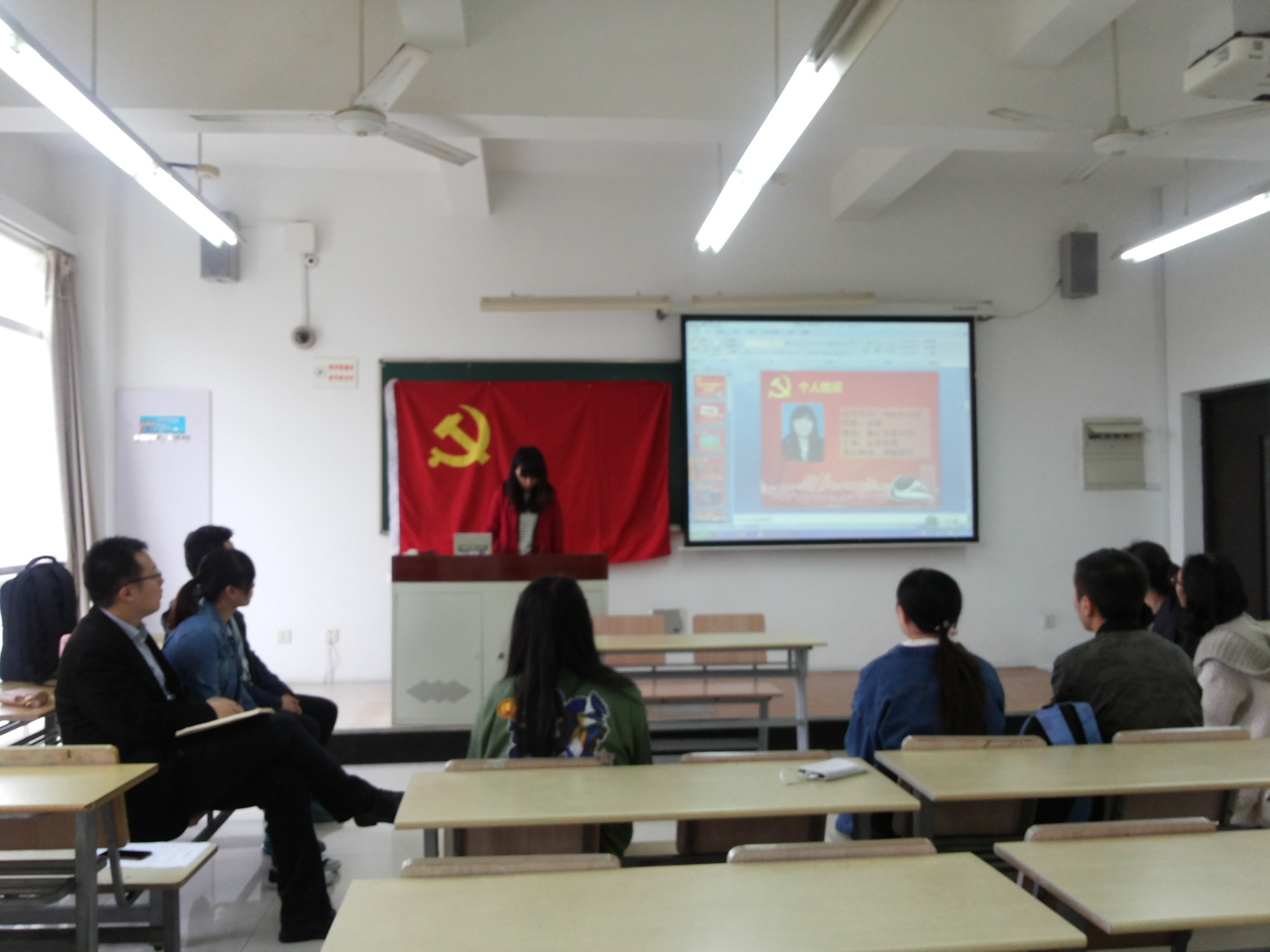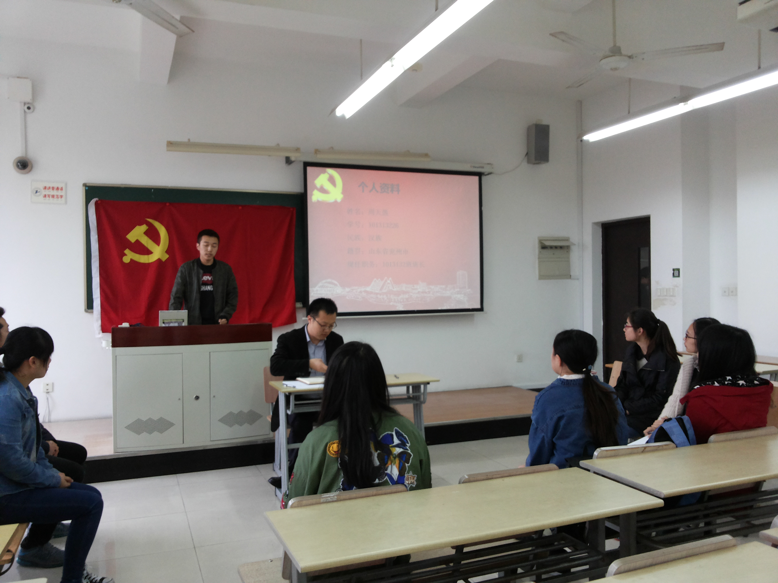接着就是王文遥和丁王蕾同学的发展前答辩。她们分别对自己的思想、学习、工作、生活、不足等方面进行阐述和总结。个人陈述之后,在场的其他成员对她们的陈述内容提出问题,最后支部书记闫冰对其作出点评,强调之后要更加注重答辩前的各种准备工作。