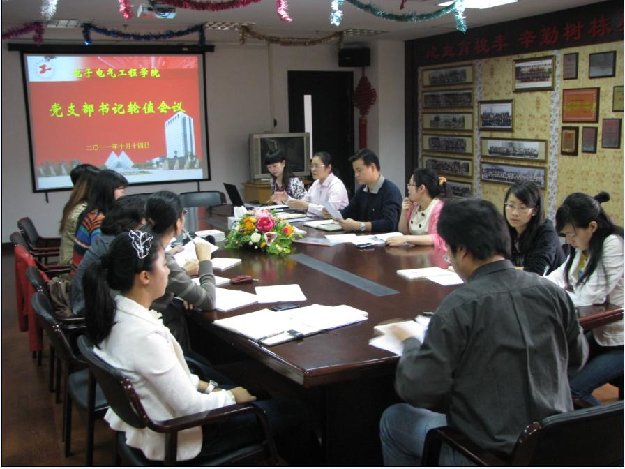 电子电气工程学院10月14日在行政楼912召开支部书记轮值会议,电子电气工程学院党委书记茅蕾和副书记王东阳及全体党支部书记参加了会议,会议由党委书记茅蕾主持。