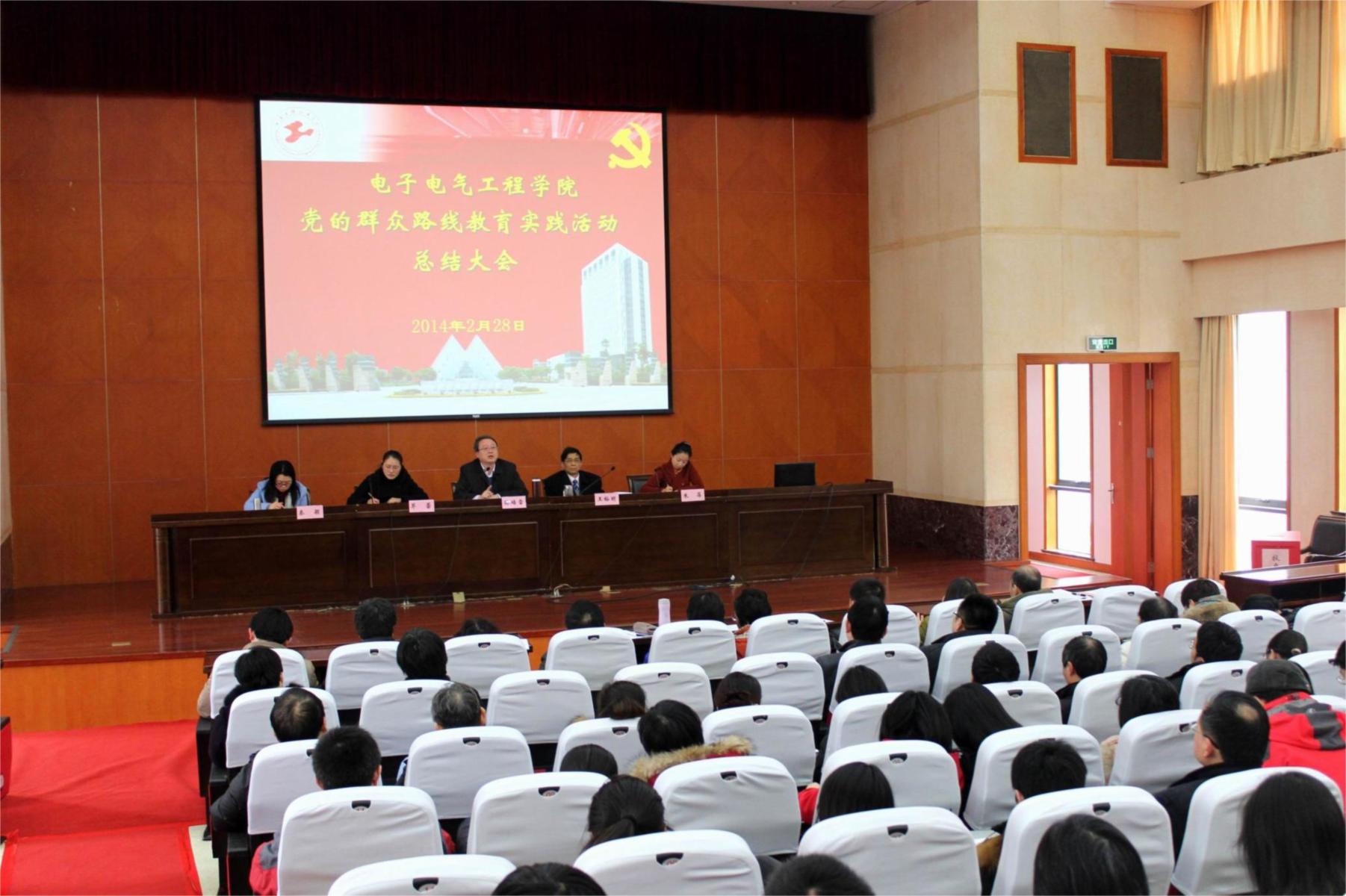 在校党委第三督导组的具体指导帮助下,自2013年9月13日电子电气工程学院召开党的群众路线教育实践活动动员大会以来,学院从学习教育和听取意见、查摆问题和开展批评、整改落实和建章立制三个环节入手,扎实抓好教育实践活动,取得了阶段性的成果,实现了预期目标。2月28日下午,学院在行政楼B301召开党的群众路线教育实践活动总结大会,孙培雷副校长、校第三督导组副组长朱蓓出席会议,学院校教代会代表、部分院教代会代表、民主党派代表、教授代表、全体教师党员和部分学生党员等118名同志参加了总结大会。大会由学院院长王裕明主持。