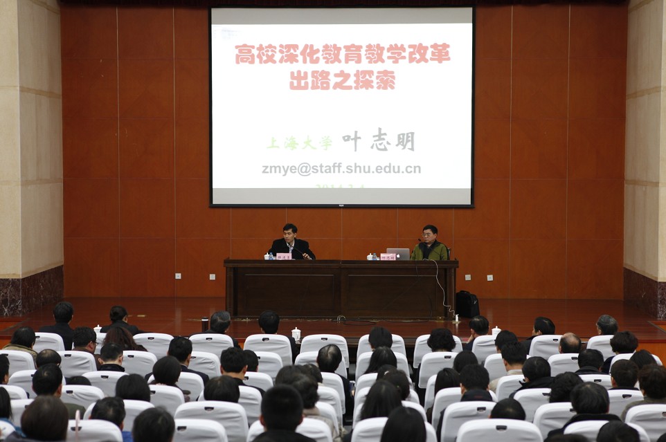 叶志明教授在报告中从三个方面阐释了自己对当前深化教育教学改革出路的思考和实践探索。他首先结合高校的现状与未来要求提出教育教学改革的原因所在。叶教授认为,当前高校在宏观上未能建立与创新人才相匹配的人才培养模式、中观上教育教学的实施路径出现了一定的偏差、微观上教师与学生的教与学的主动性没有得到调动,缺乏激情,因此,当前的高校教育教学存在着一系列问题,必须要加以改革。接下来,叶教授分析了当前高校教育教学改革所面临的形势。他从十八届三中全会提出的全面深化改革谈起,指出了当前的改革,包括教育改革都已经进入深水区,生源危机倒逼高校改革。在分析中,他结合上海大学近年来在教育教学方面推行的各项改革措施,深刻阐述了只有依靠改革才能推进学校的发展、不断提高教育教学的质量。最后,叶教授畅谈了自己关于教育教学改革的实践探索和出路思考。围绕着“培养什么样的人、怎样培养人”这个主题,他提出应该把教的创造性留给老师,把学的主动权还给学生,高校在教育过程中应建立科学的思维与思想方法,选择正确的教育手段,探索正确的教学体系。