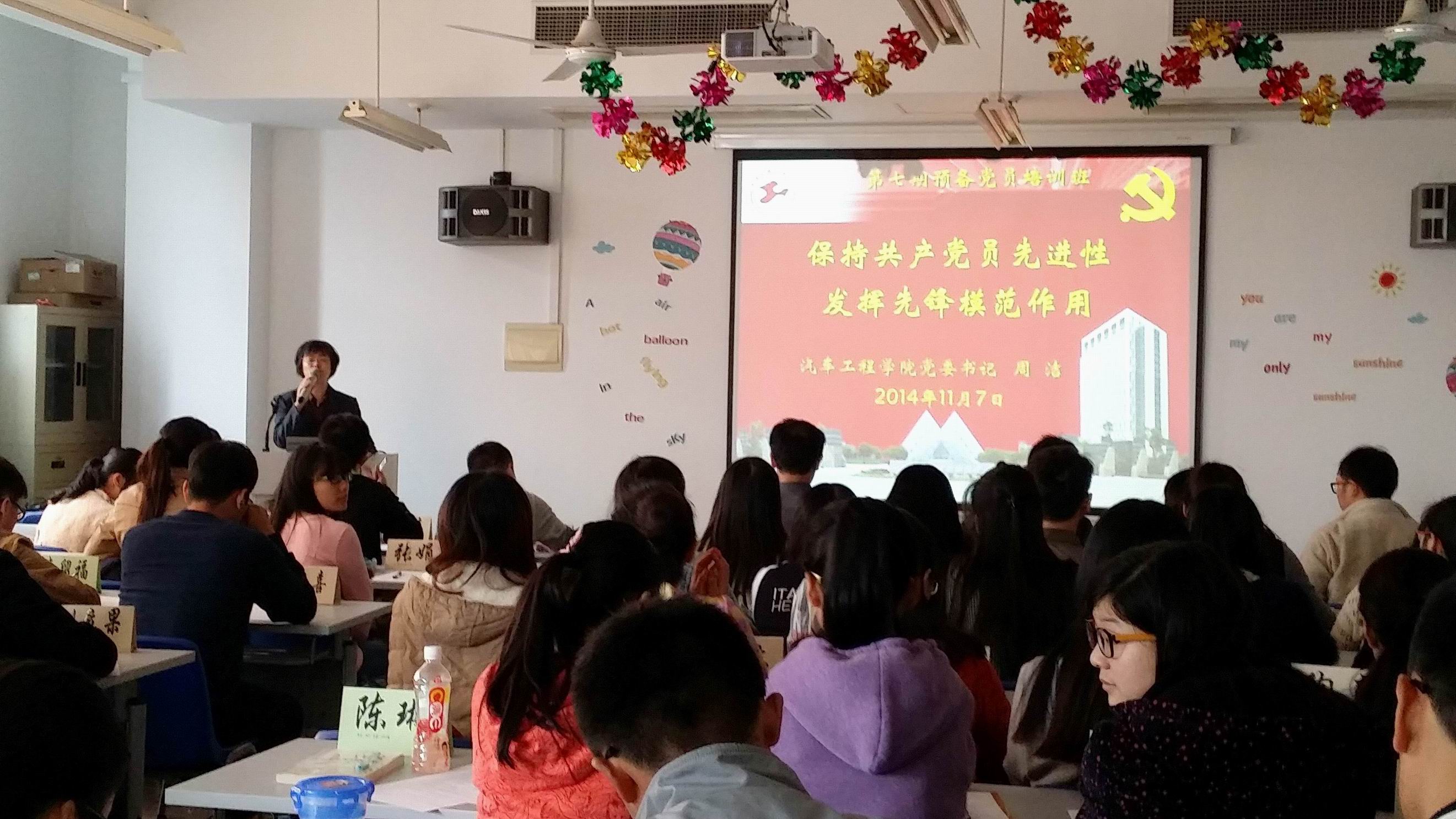 11月7日下午,上海工程技术大学第七期预备党员培训班第二讲在实训楼4405举行,汽车工程学院党委书记周洁老师给来自三个学院的全体预备党员作了名为《怎样做一名合格的共产党员》的讲课,电子电气工程学院组织员兼培训班班主任周科亮老师主持召开此次讲课。