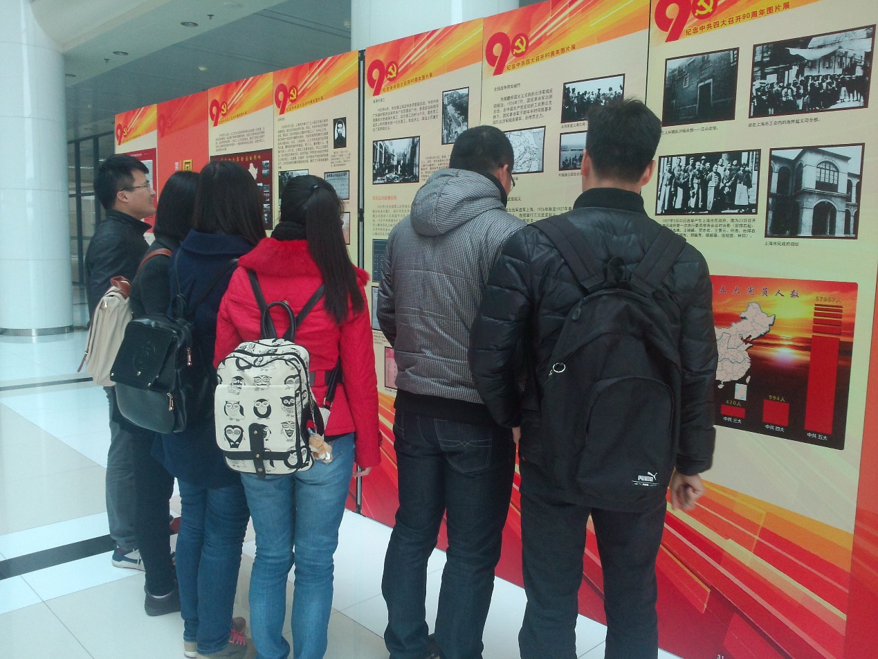 为纪念中国共产党第四次全国代表大会的顺利召开九十周年,增强大学生党员的正确的世界观、人生观和价值观,12月11日,电子电气工程学院研究生第一党支部全体成员在图书馆二楼参观纪念中共四大召开90周年图片展。该图片展以“历史的丰碑”为主题,以“历史回顾”、“纪念传承”、“时代光华”三个板块,用丰富的历史图片和文字展开介绍中共四大的历史背景、重要成果和深远意义,展示党走过的峥嵘岁月和奋斗历史。