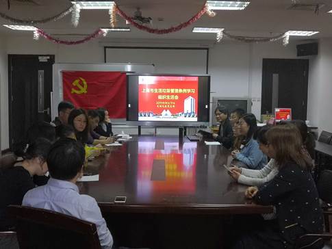 本次会议主要目的是认真学习即将全面施行的“上海市生活垃圾管理条例”。首先,王晓军书记带领大家仔细阅读了条例中的具体内容,使大家对垃圾分类的类别及主要生活垃圾的划分有了深刻的认识。在各项条例内容的学习过程中,大家同时也结合自己的生活体会阐述了对垃圾分类的认识。随着生活水平的不断提高,人们制造的垃圾成为环境的主要污染源之一,因此大家普遍认为垃圾分类迫在眉睫,作为公民和市民理应认真履行自己的责任,为营造美丽的市容市貌做出应有的贡献。