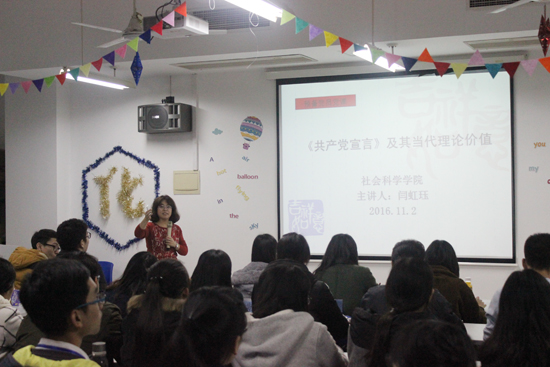 11月30日晚,上海工程技术大学第十一期预备党员培训班第四课在实训楼4405展开。社会科学学院的闫虹珏老师以“《共产党宣言》及其当代理论价值”为主题展开课程。