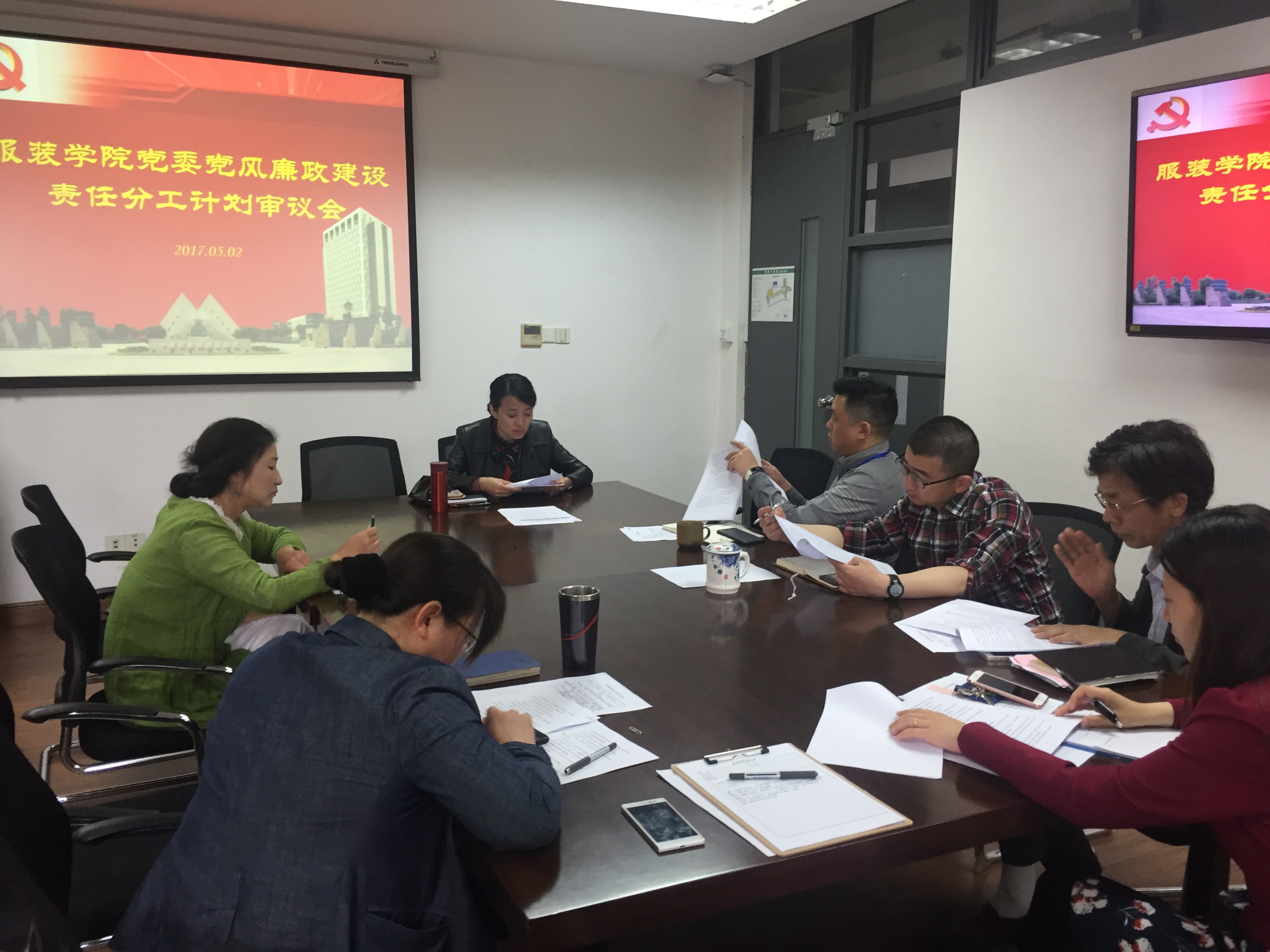 会上,分别就落实项目、目标任务、工作举措、时间节点、具体实施部门五部分内容,逐一研究审定了党政领导班子成员提交的《党风廉政建设主体责任计划书》。各位领导班子的责任计划书涵盖了“夯实推进两学一做,加强党员干部学习培养”“建立健全服装学院二级管理制度”“各类学生评优奖项条例修订”“国际化合作项目制度化建设”“建立和健全学生学业预警机制和干预机制”“研究生招生流程规范化管理”等内容。会上,服装学院班子成员针对学院中心工作和2017年分工情况充分讨论、民主发言,并在此基础上形成党风廉政建设工作年度责任分工计划。