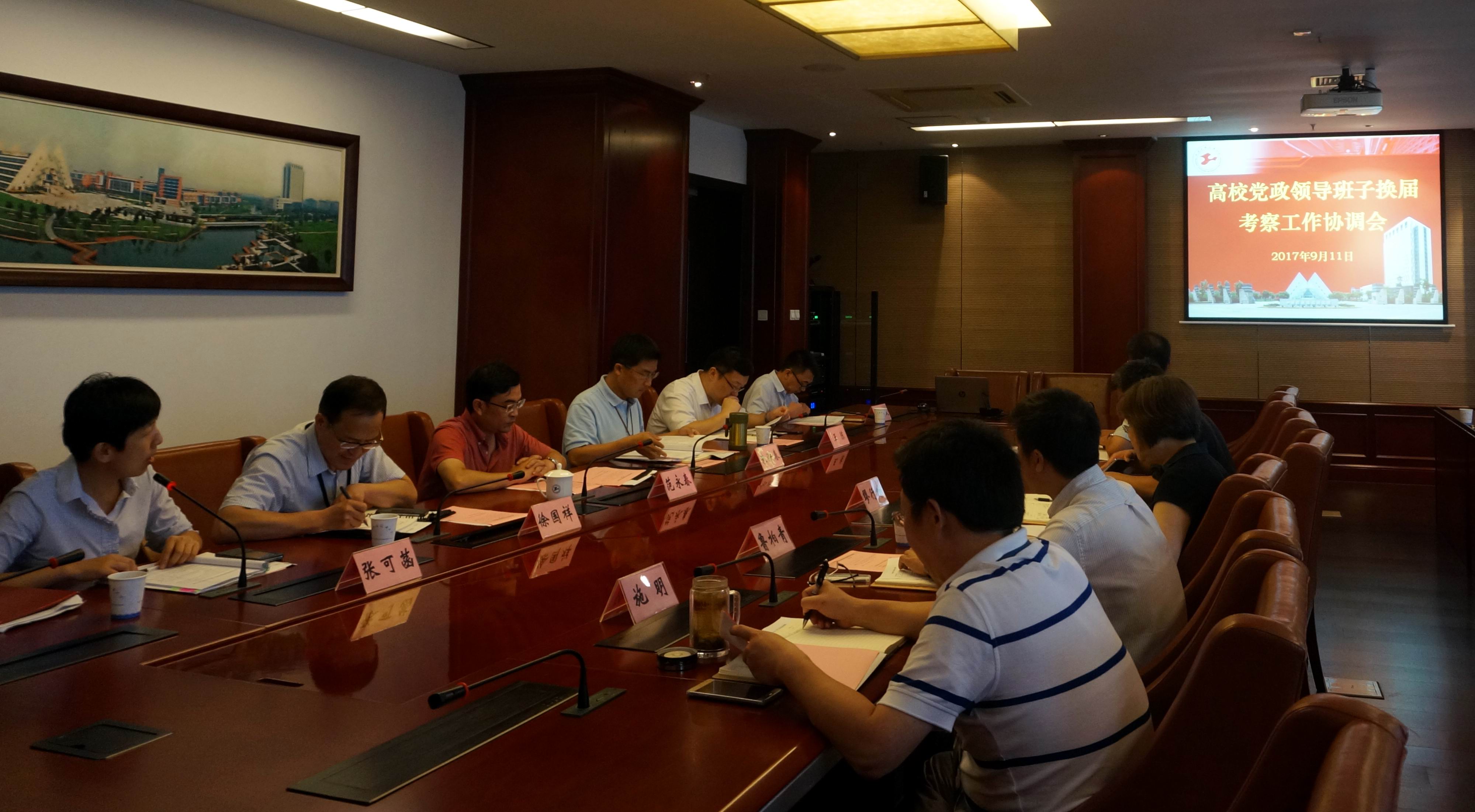 9月11日下午,学校在行政楼406会议室召开了党委领导班子换届考察工作协调会。校党委副书记范永春出席会议,党办、校办、纪委办、组织部、人事处、资产与实验室管理处、后勤实业发展中心、信息化办公室负责人参加会议,会议由校党委组织部副部长张可菡主持。