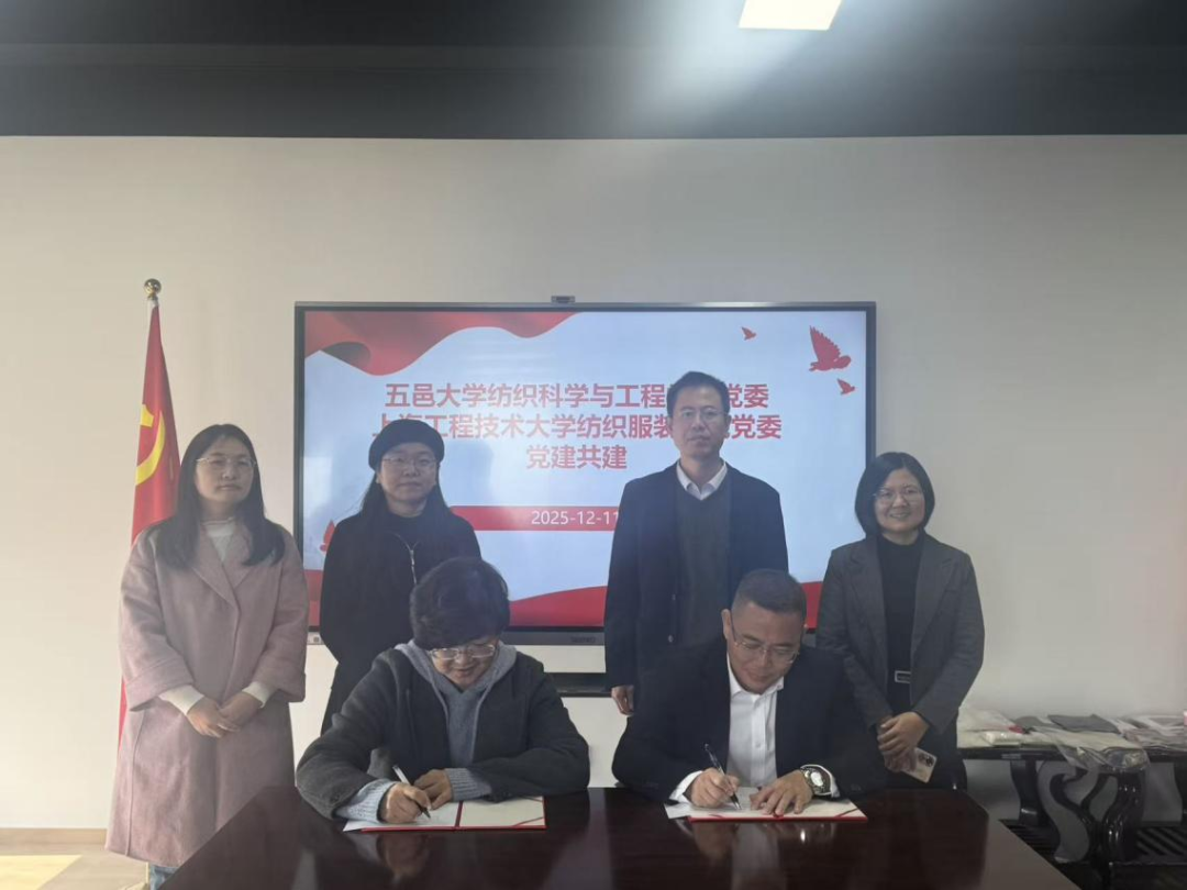 会上,上海工程技术大学纺织服装与五邑大学纺织科学与工程学院党委签订党建共建协议。双方就加强党建交流和共建,在纺织工程学科建设等方面加强合作,携手打造一流纺织学科的协同发展为目标,建立常态化交流机制,共同为纺织产业转型升级贡献智慧力量。