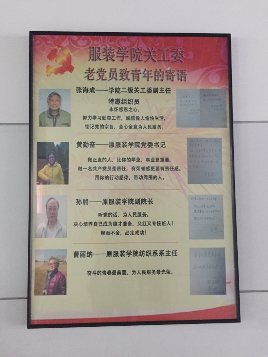 服装学院党委关工委响应党组织号召,在“两学一做”学习教育内容的指导下,关工委老党员与青年党员进行面对面交流,帮助青年党员明确对于“如何做一名合格党员”这一贯穿党员学习工作中的问题的解决方法。为了发扬老党员严于律己、艰苦奋斗的精神,学院党委通过展板的形式将老党员的寄语展现出来,让党员中的新生“血液”更清晰懂得如何做一名合格的党员,同时也激励青年党员能够做到在日后的学习生活中以一个合格党员的准则不断地审视自己,成为学院、社会、国家的先锋力量。学院二级关工委副主任张海成老师作为学院特邀组织员向青年党员提出两点要求:一要永怀感恩之心。要努力学习勤奋工作,诚信做人愉快生活;二要铭记党的宗旨,全心全意为人民服务。原服装学院党委书记黄勤奋老师寄语到:做正直的人,比你的学业、事业更重要;做一名共产党员是责任,有荣誉感更要有责任感;用你的行动感染,带动周围人。原服装学院副院长孙熊老师寄语到:听党的话,为人民服务。决心培养自己成为德才兼备,又红又专接班人!锲而不舍,必定成功!原服装学院纺织系系主任曹丽纳老师寄语到:奋斗的青春最美丽,为人民服务最光荣。