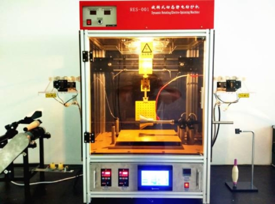 旋转式动态静电纺纱机主要由高压静电模块、纺丝液的存储和流动模块、纺丝料筒与喷丝头的搭配模块、喷丝头运动控制模块、接收器模块、卷绕模块、调温调湿模块、照明模块和通风模块等组成。在高压电场的作用下,纺丝液被抽长拉细,形成纳米纤维,利用不同形状的接收器接收纳米纤维并形成纳米纤维集合体。主要应用于纺织制造领域,可以根据不同的工艺需求制备纳米级纤维及其制品,其中包括纤维网、纯纺纱、包芯纱等。