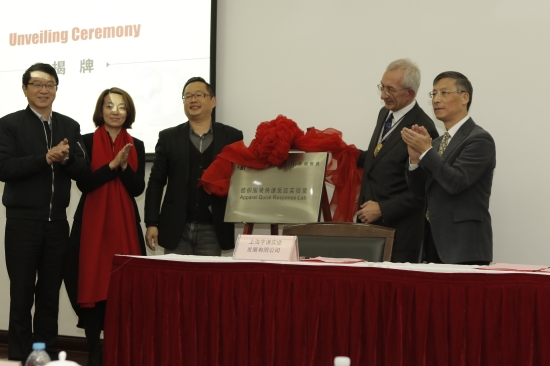 签约仪式后,英国皇家染色家协会主席Trevor Harry larkins先生、英国皇家染色家协会首席执行官Graham Maurice Clayton先生、上海纺织工程学会秘书长马平春先生、上海市纺织协会秘书长刘寅峰先生、上海亨谦实业发展有限公司CEO陈建志先生、柯镂软件开发(上海)有限公司总经理李德杓先生、我校服装学院党委书记袁蓉副教授、服装学院副院长李艳梅教授共同为联合实验室和基地揭牌。揭牌仪式后,英国皇家染色家协会市场营销及公关主管Tracy小姐向与会人员与参赛者介绍了大赛的评审规则以及评审团嘉宾。