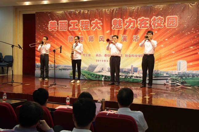 高职学院工会为进一步加强教师职业道德建设,充分展示广大教师爱岗敬业、快乐工作、幸福生活的精神风貌,弘扬当代教师教书育人、为人师表的职业情操,5月31日下午,在学院党委书记柳如荣、工会主席沈国平的带领下由树长根、王才峄、郑昊、虞仲男组成的小乐队参加了在松江校区图文信息中心第二报告厅举行的的“美丽工程大·魅力在校园”师德师风展演活动,活动由学校工会主办、基础教学学院工会和社会科学学院工会承办,学校党委书记滕建勇、副书记田信灿、褚劲风、副校长孙培雷、校工会常务副主席沈海庆等领导出席,学校20个学院党政领导出席并担任评委,各学院(部门)工会主席及参展表演和师生代表300余位参加了活动。高职学院荣获最佳表演奖。