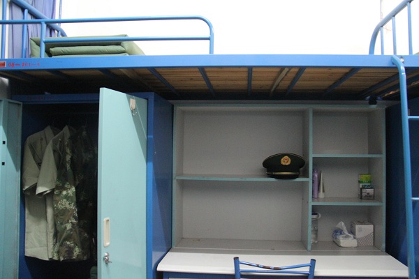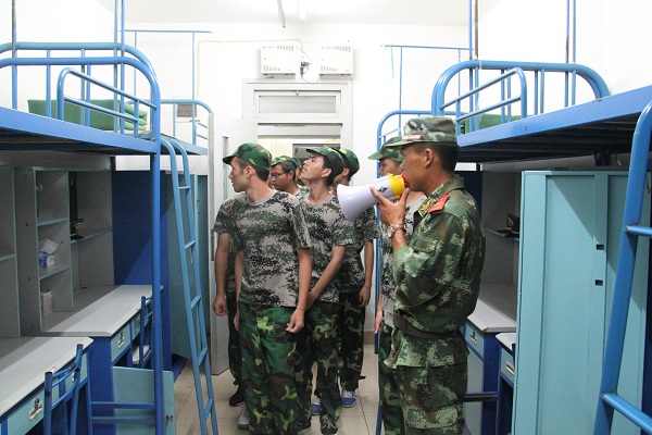 6张床铺上,枕头、棉被摆放整齐,刷牙杯整齐统一地摆在架子上;床下,鞋子一条线,摆放得整整齐齐;桌上杂物全无,地面一尘不染。俨然到了军营一般。平整的床面、整齐的衣物、统一的标准给新生们留下了深刻的印象,他们对教官规范有序的内务赞叹不已。
