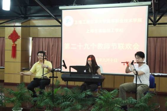 表彰活动结束后,在学院罗胜强老师的主持下,令人兴奋的联欢活动开始了。首先由11位新进教师自报家门并合唱了歌曲《最炫民族风》,高职学生“十佳校园歌手”冠军许倩深情演唱了《至少还有你》,联欢活动中进行了互动节目:看图表演;猜成语及生活用品等,活动气氛十分活跃,最后树长根、虞仲男两位老师和高职同学演出的民族器乐表演《荷塘月色》清新自然、委婉动听、深深地打动着在场每一位老师。联欢会演出节目中间还穿插了老师们喜欢的抽奖环节。