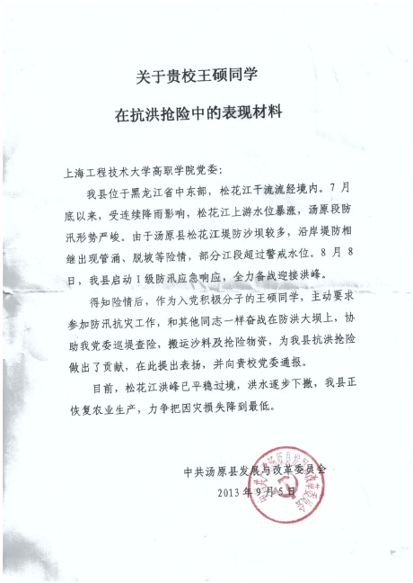 20139月,上海工程技术大学高职学院党委收到一封来自中共汤原县发展与改革委员会特殊的来信,对学院机电工程系12级应用电子2班的王硕同学在县防汛抗灾中做出的积极贡献进行了表扬。