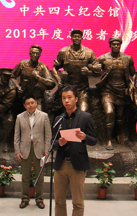 深秋是个收获的季节,一年来,高职学院、高级技校与中共四大的合作可谓硕果累累。11月8日下午2013年度中共四大纪念馆志愿者表彰大会在中共四大纪念馆序厅召开。虹口区文化局局长中共四大纪念馆馆长陆健、虹口区文明办副主任隋蓓、高职学院高级技校团委书记桂佳老师和受表彰的志愿者单位、个人出席了此次大会。