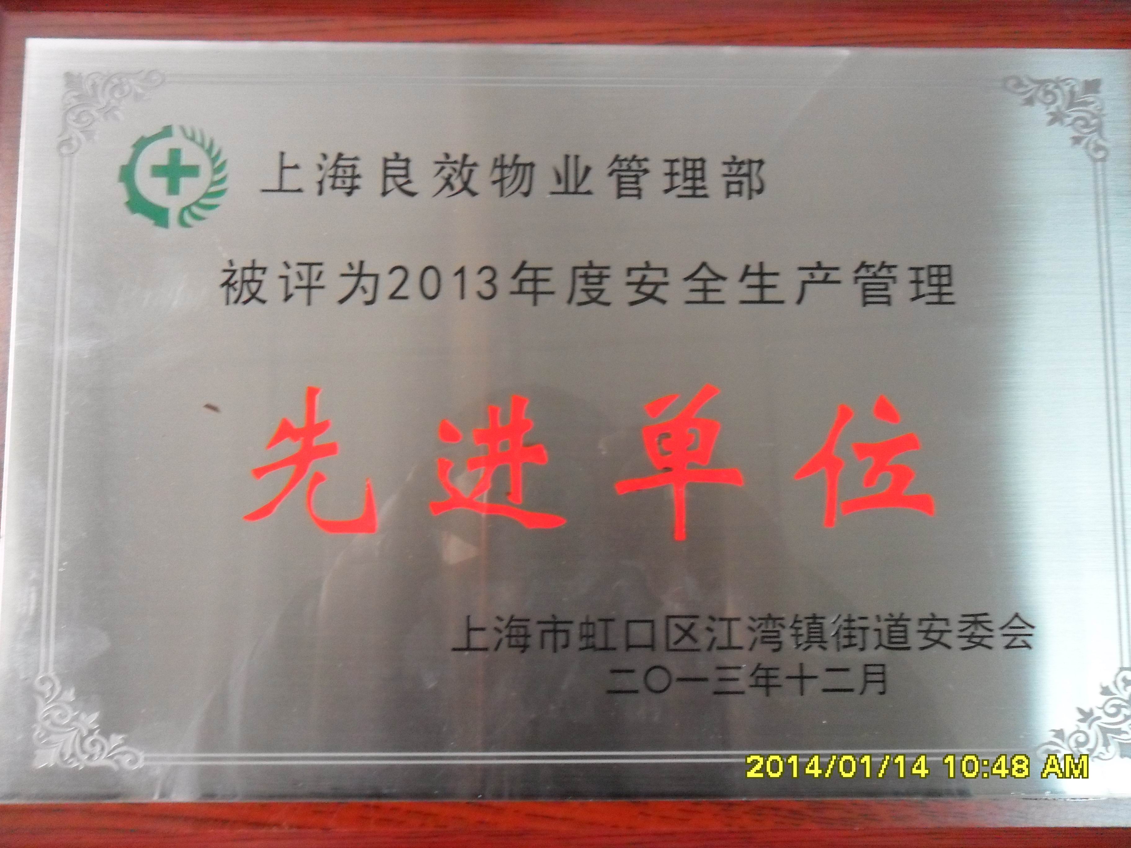近期,高职学院、高级技校校产办良效物业被上海市虹口区江湾镇街道安委会授予“2013年度安全生产管理先进单位”。良效物业已是连续8次被评为“安全生产管理先进单位”。