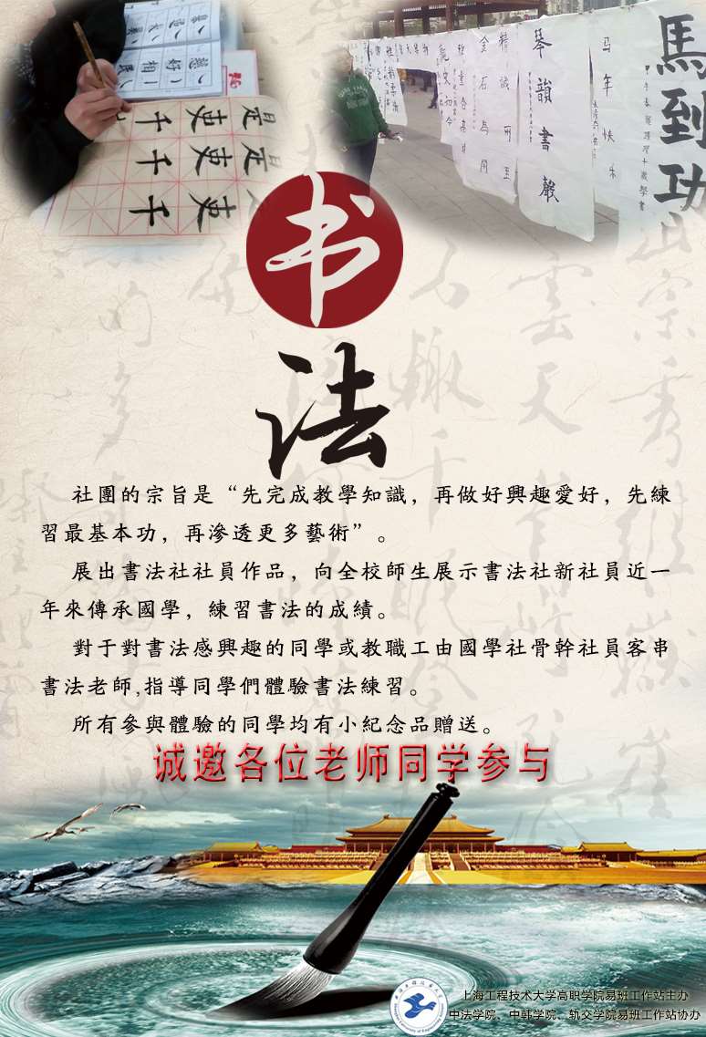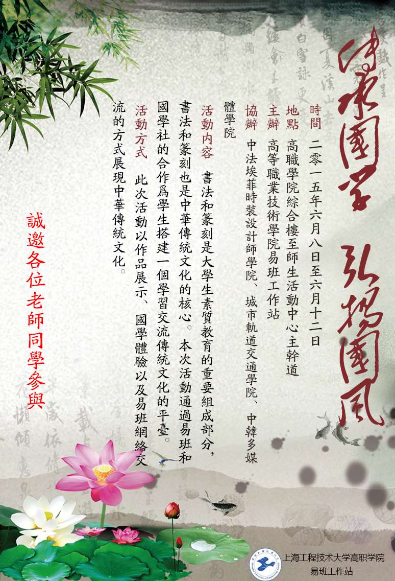 2015年6月8日中午,高职学院易班工作站在师生活动中心大厅发起了“承千年精粹,扬文化新风”传统文化主题中第一阶段“传承国学,弘扬国风”国学体验活动,本次主题活动由高职学院主办,中法埃菲时装设计师学院、城市轨道交通学院、中韩多媒体学院协办,至此高职学院校级易班主题文化活动拉开了序幕。