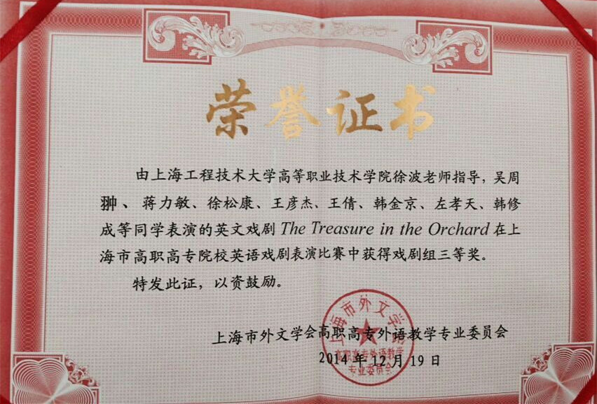 近日,由上海市外文学会高职高专外语教学专业委员会传来喜讯,高职学院在基础教学部徐波老师的指导下组队参加上海市高职高专院校英语戏剧表演比赛,喜获三等奖。吴周翀、韩金京、王倩等八名学生利用二十多天的业余时间、创作剧本、精心排练。在没有戏剧服装、道具、布景等诸多困难条件下,自信满满地与上海市三十八所高职高专(包括民***院校)非英语专业和英语专业的参赛团队进行了激烈角逐。