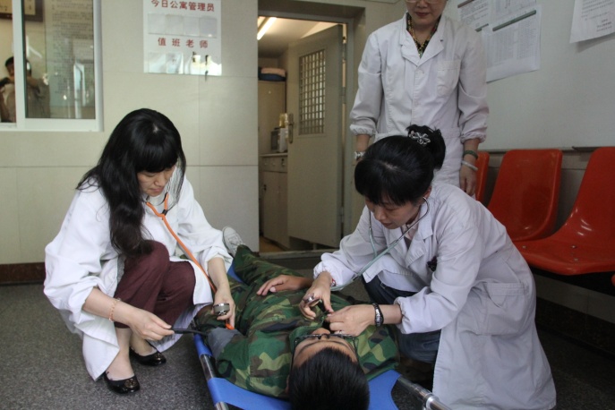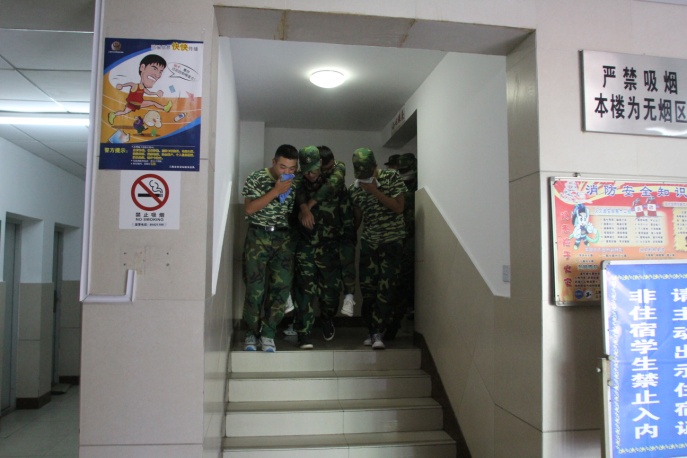 中午14:30,高职学院党委书记柳如荣宣布消防演习正式开始,随后 11号楼拉响警报,4楼5楼开始冒出红色的烟雾,并逐渐弥漫到室外,宿舍管理员用广播提示同学们宿舍楼发生火灾,需要立即逃生。随即,学生们口捂湿毛巾,快速有序地从消防通道撤离,医务室工作人员将模拟受伤学生用担架抬出进行诊治。