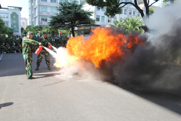 当所有学员撤离至师生活动中心场地,学院组织学生们学习了灭火器的使用方法。在工作人员详细地讲解与亲自示范后,20名同学亲自上阵,进行灭火。整个消防演习持续了近40分钟。