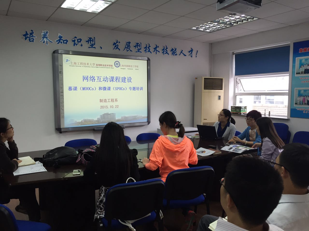 2015年10月22日下午1点,高职学院、高级技校制造工程系在技能楼教学研讨室组织召开了网络互动课程建设——慕课(MOOCs)和微课(SPOCs)专题培训,院、校办,教务科和北京超星公司技术人员以及制造工程系部分空班教师参加了培训学习。
