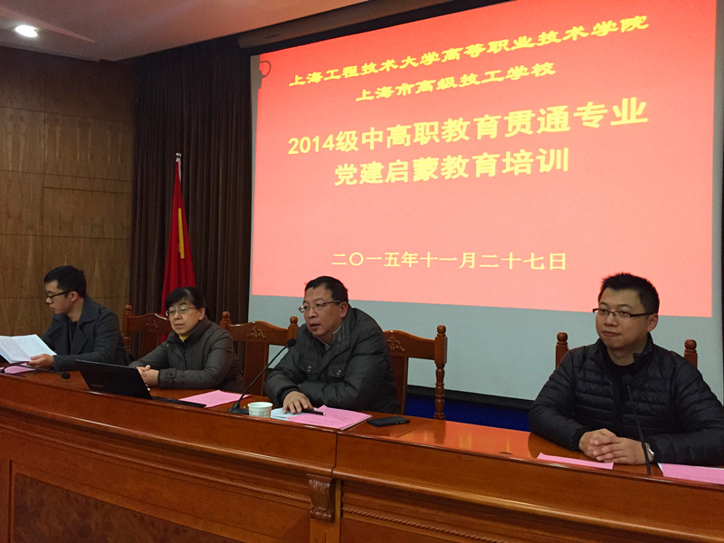 高职学院、高级技校依托上海工程技术大学、上海市高级技工学校垂直教学通道,共享校园环境的优势,大力探索针对中高职教育贯通专业的党建发展工作。在进行了一年的中高职贯通专业党建培养探索的基础上,学院、校于2015年11月27日中午12:00在综合楼十一楼思进厅举行2014级中高职教育贯通专业党建启蒙教育培训。