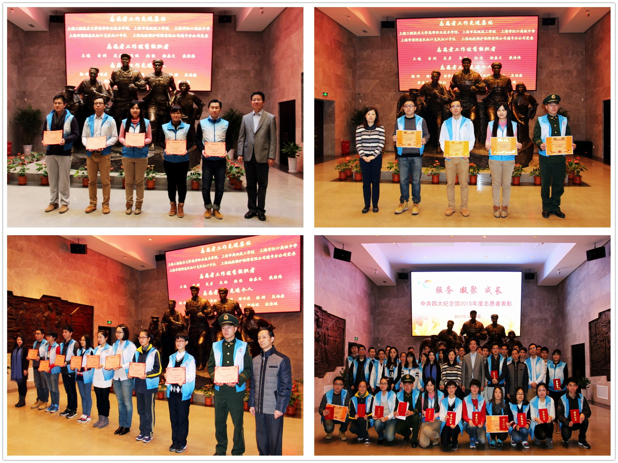 虹口区文明办、区志愿者协会、中共四大纪念馆的领导为先进集体和个人颁奖。桂佳老师荣获志愿者工作优秀组织者,张亦菲、徐漪等4名志愿者获评先进个人称号、学院荣获志愿者工作先进集体。