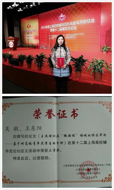由上海市教卫党委、上海市教委主办,由市教卫系统思想政治工作研究会、市德育发展研究中心以及《思想理论教育》杂志社协办,由东华大学承办的2015年度上海高校辅导员建设月总结会暨第十二届辅导员论坛于2016年1月12日下午在东华大学演讲厅举行,高职学院吴敏、王东阳撰写的论文《主流理论在“微媒体”场域的供求平衡——基于对高校青年大学生的分析》在众多优秀文章中脱颖而出,获得了第十二届上海高校辅导员论坛三等奖。来自上海市40余所高校的学工部(研工部)部长、思政科科长以及辅导员代表参加了本次大会。