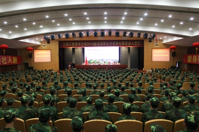 下午1点45分,高职学院全体受训学员以连为单位,在带训教官的指挥下陆续进场,身着迷彩服的新生们个个精神饱满,会场上出现了一片绿色迷彩的海洋。