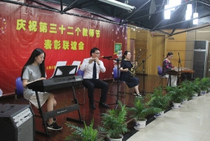 朱建芳、唐燕华、顾小玲、树长根的男女声四重唱《八月桂花遍地开》韵味十足,这是今年学院合唱队代表工程大参加上海市教委举行的合唱比赛以及江湾镇红歌会的优秀曲目。树长根、虞仲男、刘润、刘国粹老师为大家演奏了耳熟能详的新民乐《荷塘月色、南泥湾》把教师节表彰会推向了高潮。