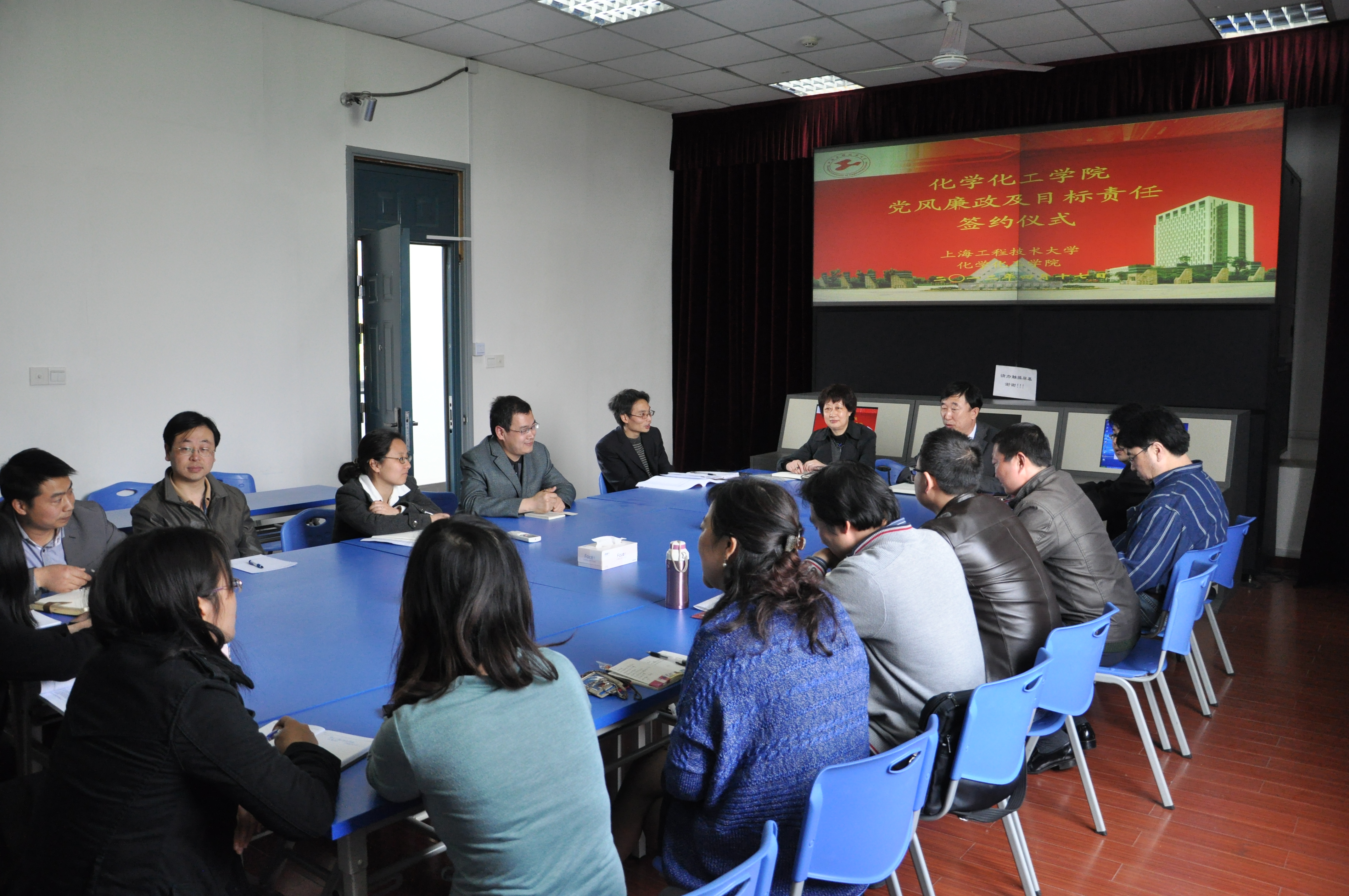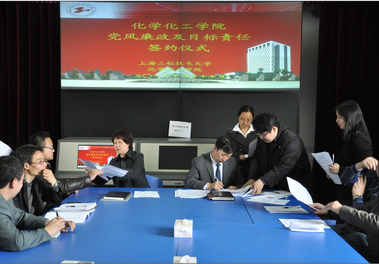为进一步落实“十二五”规划,继续推进我校文化建设、师资队伍建设、科研、教学、学生、等各方面的工作全面开展。4月17日下午,化学化工学院在实训楼3A201召开了了2012年度党风廉政建设责任书及年度目标责任书的签约仪式。出席会议的有党总支书记刘宇虹、院长徐菁利、副书记熊筱晶、副院长甘文君、饶品华,以及各师生党支部书记和各系主任。会议由学院院长徐菁利老师主持。