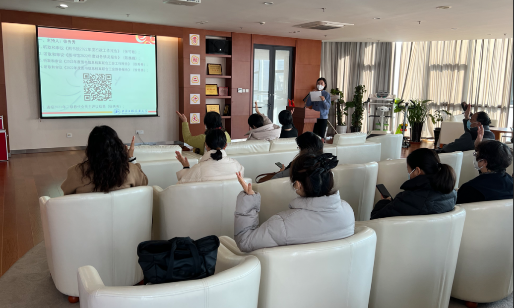 会议在庄严的国歌声中正式开幕。会上,教职工审阅了《图书馆2022年行政工作报告》、《图书馆2022年财务报告》以及《2022年度图书信息档案联合工会工作报告》和《2022年度图书信息档案联合工会财务报告》;徐秀秀老师通报了2021年二级教代会民主评议中层领导班子和领导干部结果;并在会上进行了2022年二级教代会民主评议中层领导班子和领导干部、2022年度中层干部考核测评、2022年度科(职)级干部选拔任用“一报告两评议”工作。