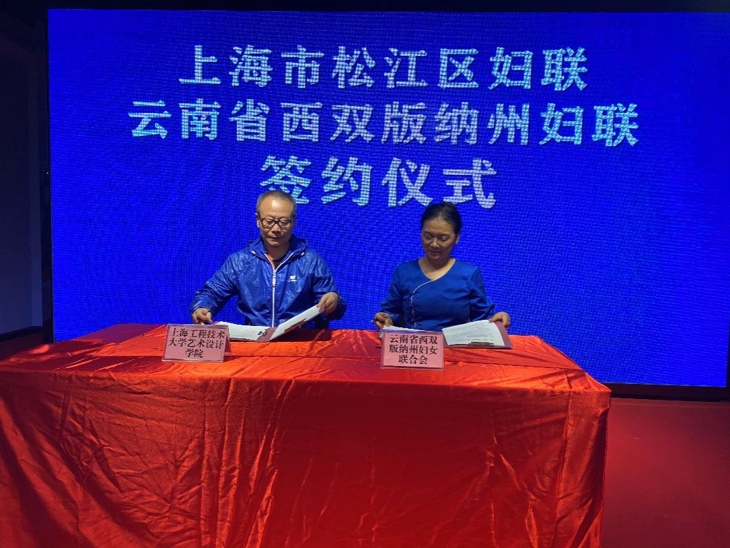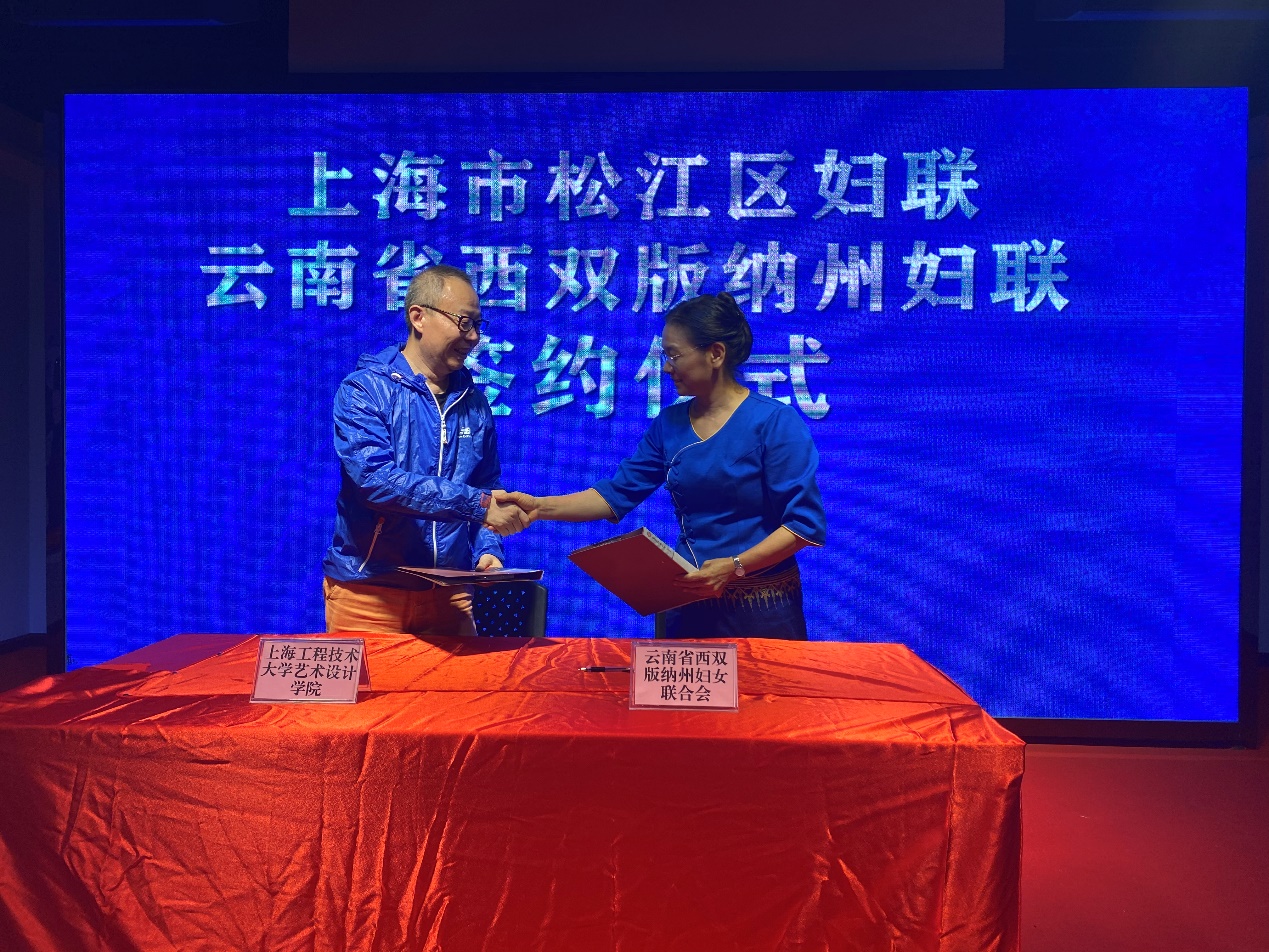 2020年8月24号,松江区妇联与西双版纳州妇联签约仪式在西双版纳州聚匠非遗文化交流传播中心举行,双方就对口扶贫协作工作情况及今后帮扶协作意向进行了深入交流和探讨,签订了《云南西双版纳文化创意产品合作协议》。艺术设计学院党委副书记、院长高瞩教授作为高校代表与云南省西双版纳州妇女联合会共同签署了《关于“松江—西双版纳”地校合作意向书》。两项协议的签署旨在促进文化创意产业的开发和创新,助力女性创新创业,丰富扶贫协作举措,更好地促进云南当地文化创业产业深度开发和创新,服务当地经济社会生活。。