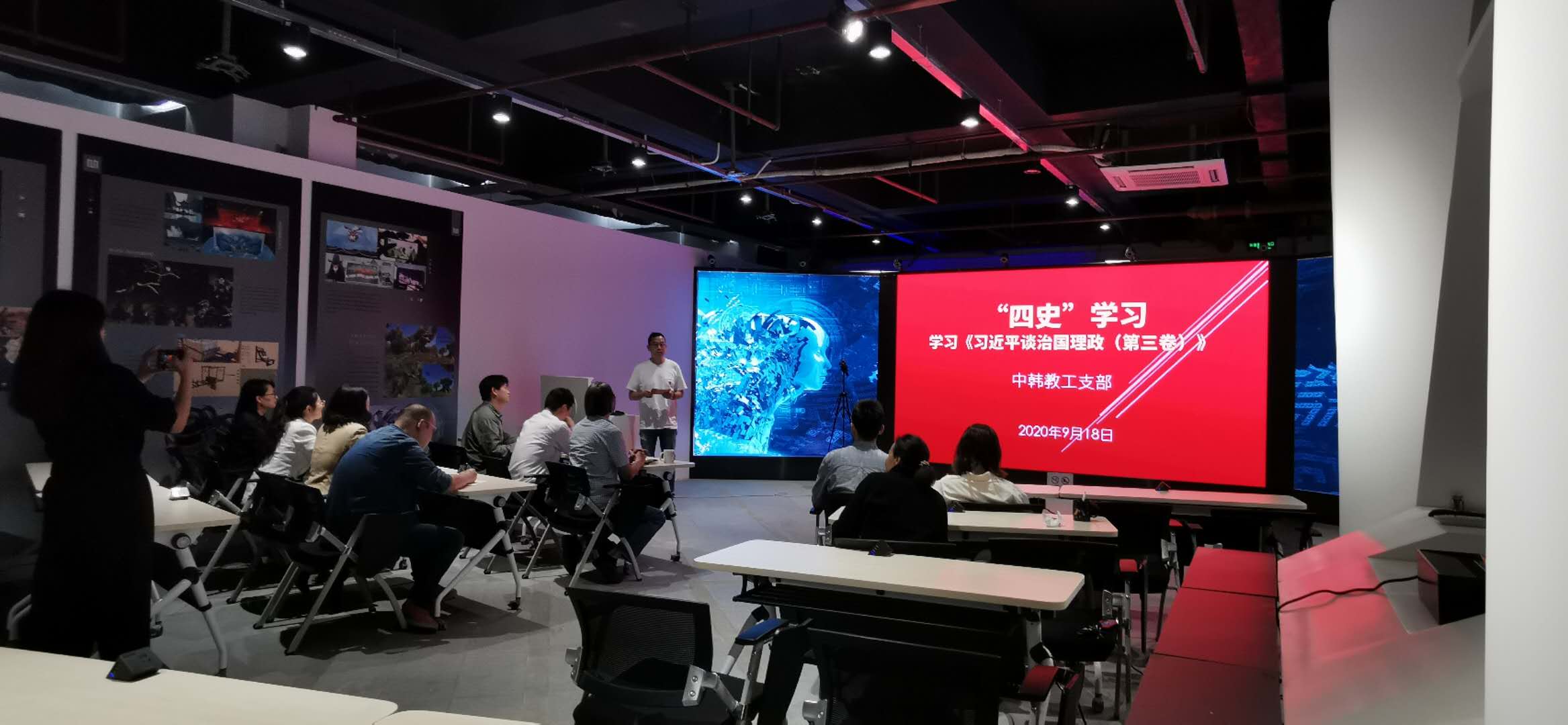 根据《上海工程技术大学关于认真组织学习〈习近平谈治国理政〉第三卷的通知》精神,和艺术设计学院党委“四史”学习教育工作方案的学习要求,2020年9月18日下午14:30,由刘宏江委员主持,中韩教工党支部在虚拟现实实验室召开学习《习近平谈治国理政(第三卷)》活动。该书收入了习近平总书记在2017年10月18日至2020年1月13日期间的报告、讲话、谈话、演讲、批示、指示、贺信等92篇,分为19个专题,本次学习第一个专题“谱写新时代中国特色社会主义新篇章”。
